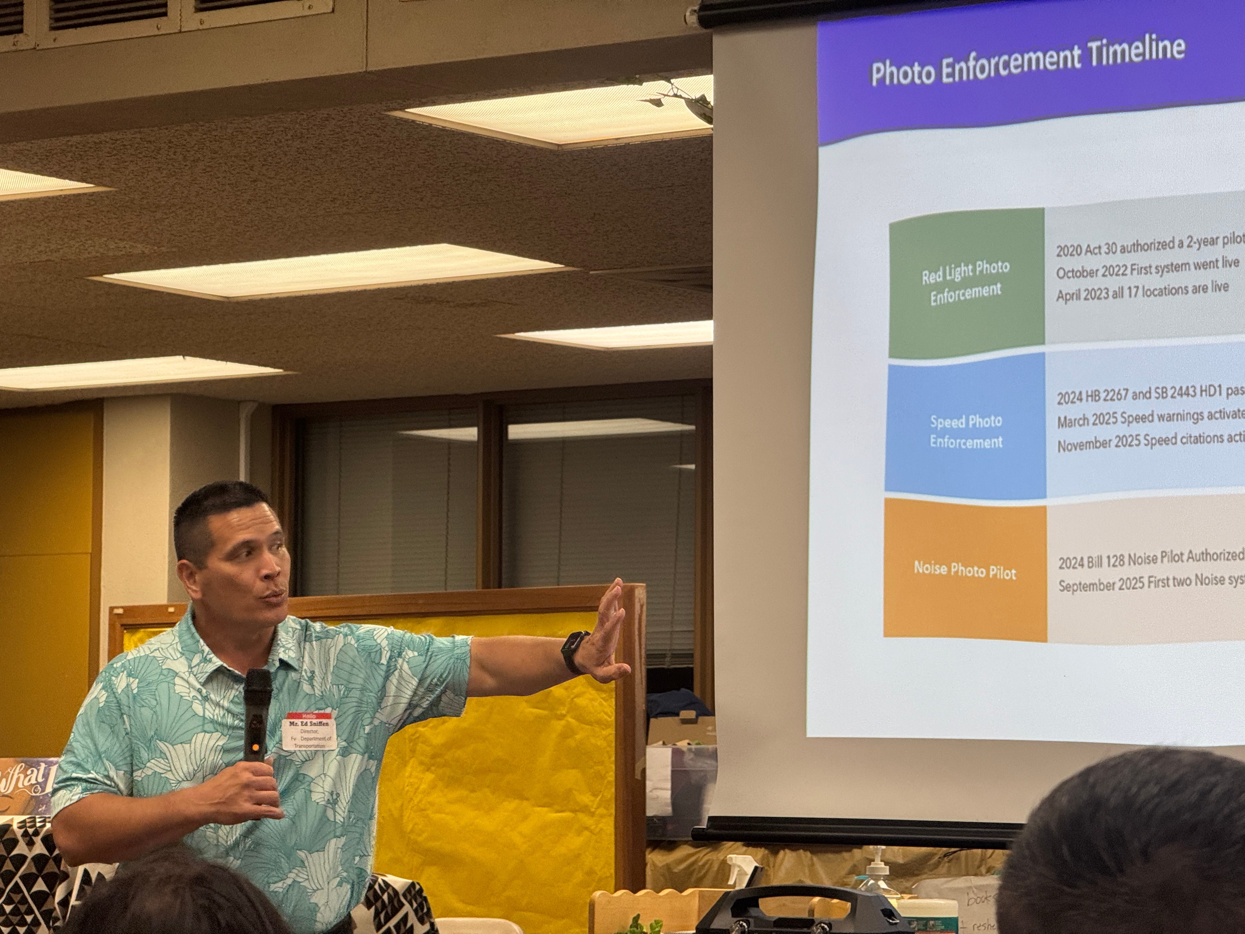 Hawaiʻi Department of Transportation Director Ed Sniffen detailed three enforcement programs: red-light, speed, and noise cameras selected by crash and violation data and placed where courts can process cases. He said the goal is deterrence: camera locations are disclosed and warnings preceded citations.